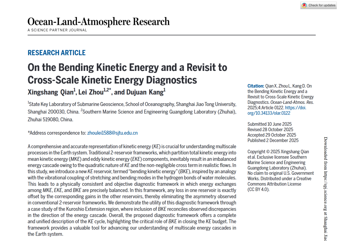 近日,上海交通大学海洋学院博士生钱星赏在Science合作期刊Ocean-Land-Atmosphere Research上发表了题为“On the Bending Kinetic Energy and a Revisit to Cross-Scale Kinetic Energy Diagnostics”的研究论文,海洋学院周磊教授为通讯作者,康杜娟副教授为合作者。上海交通大学海洋学院和海底科学与划界全国重点实验室为第一完成单位。