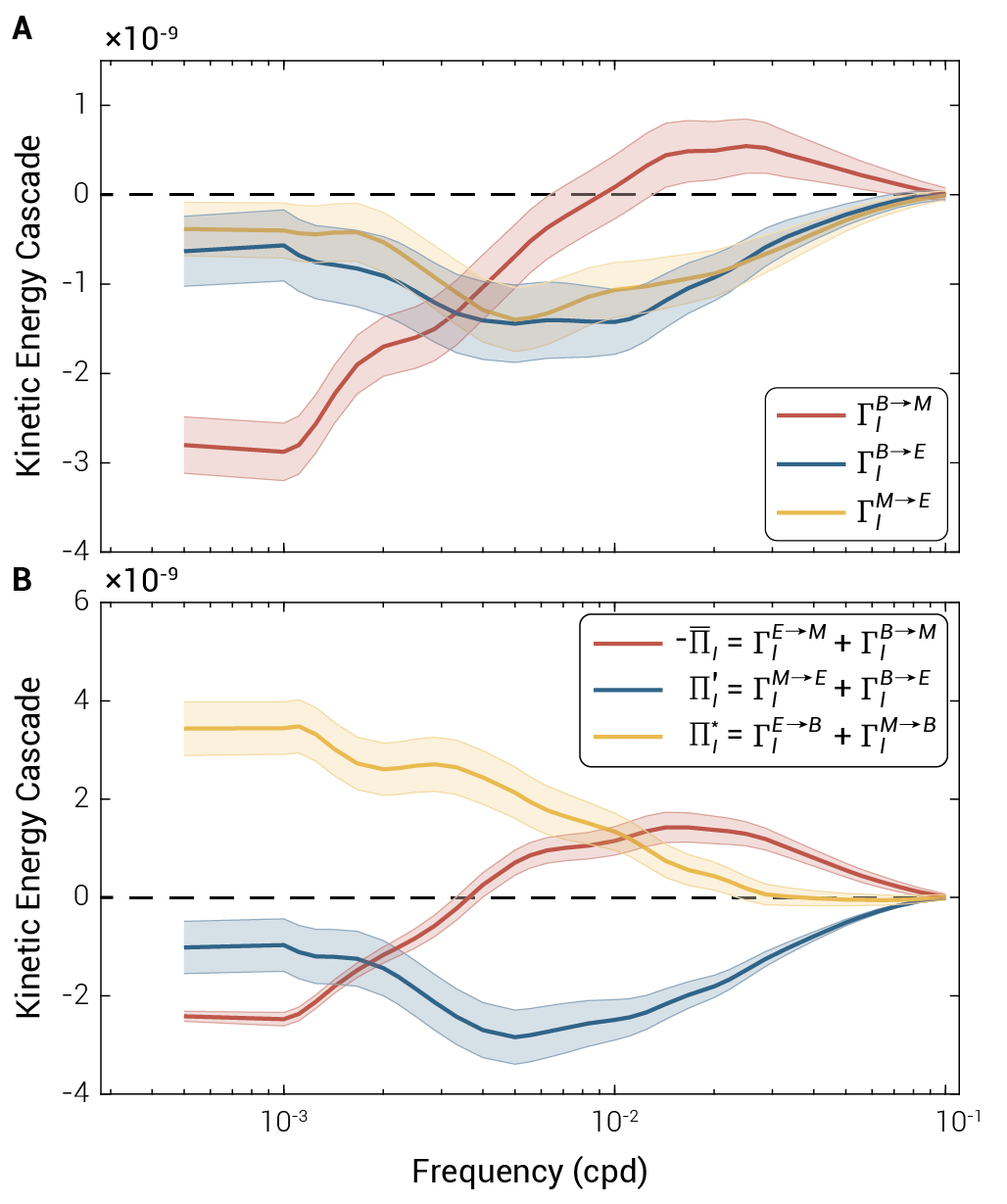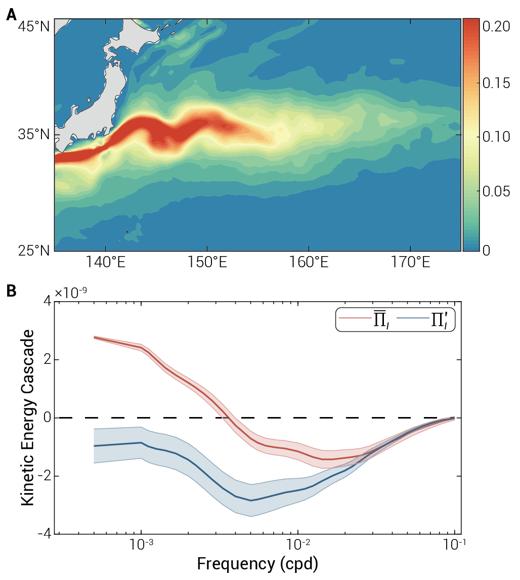 图1. (A) 为黑潮延伸体区域上层1000米平均的总动能;(B) 黑潮延伸体区域平均的动能串级项,红线代表以MKE变率衡量的动能串级,蓝线为以EKE变率衡量的动能串级,虚线上下方分别代表动能正向串级和逆向串级。对于同样的黑潮过程,以MKE变率衡量和以EKE变率衡量,可能在动能串级方向上得到相反的结论。