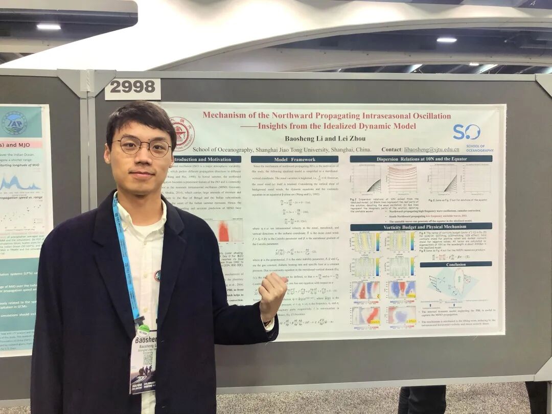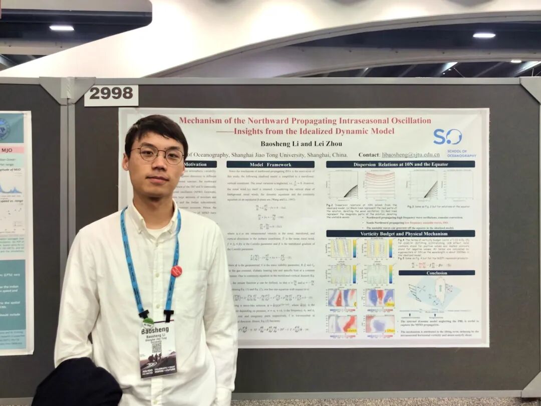 对科研的深入认识和积累帮助李保生在海气相互作用领域有了表达自己认识和观点的机会。2019年,他发表了博士期间的第一篇学术论文,该论文探讨了季风的超低频变化,为其博士的研究内容提供了背景支撑。半年后,第二篇关于季风低频信号和台风相互作用的文章发表在《Journal of Geophysical Research:Atmospheres》,该文章从多尺度相互作用的角度揭示了季节内信号对于台风生成位置的调控作用,为台风的预报提供了新的理论支撑。同时,李保生还致力于揭示出季风动力学的新机制。为了能深入了解最前沿的研究进展,他于2019年7月和12月分别参加了Asia Oceania Geosciences Society和American Geophysical Union组织的两场国际学术会议并在会上做学术报告,2019年10月在第六届青年地学论坛进行口头报告。李保生在台风、季风及其预报等方面的研究成果发表在高水平国际期刊,表现出了优异的科研潜质,并因此获得2020年国家奖学金。